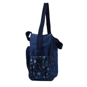 Bolsas de pañales impermeables con bordado de león fabricadas por una fábrica de pañales china, tela principal de poliéster 600D, forro de poliéster 210D, impresión completa de 4 colores en el panel frontal y el panel posterior, un bolsillo frontal con estampado de estrellas y decoración de bordado de león.